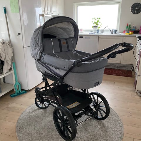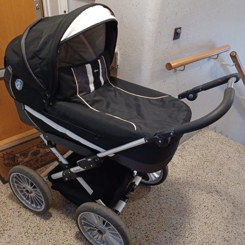 Flot og velholdt emmaljunga barnevogn. Vognen har punkterfri dæk og drejehjul. Den har indbygget fluenet og solsejl. Der medfølger lift,madrasser, sele og regnslag