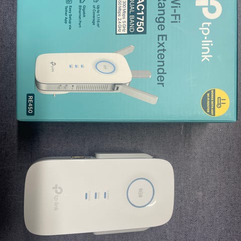 TP-Link netværksforstærker i hvid. Enheden er beregnet til udvidelse af trådløst netværk i hjem eller mindre kontorer. Den tilsluttes eksisterende netværk og kan hjælpe med at forbedre dækning i områder med svagt signal. Velegnet som ekstra netværkskomponent i et WiFi-setup.