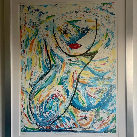 Sælges samlet- 2x Jørgen Nash litografi 63/150 “Mexico Blues” i flerfarver. Og Jørgen Nash litografi 63/150 “Take it easy boy boy” Motivet viser et ansigt i et ekspressivt, abstrakt udtryk med dominerende blå, grønne, gule og røde nuancer. Trykket er signeret "Jørgen Nash 1975" 52x56 cm. Litografiet er indrammet med passepartout i lys ramme. Velegnet som vægkunst i stue, kontor eller andre opholdsrum. Der er lidt torden fluer under glasset på det ene billede.