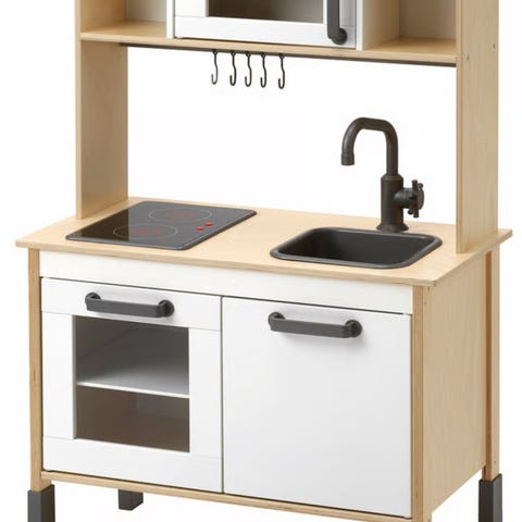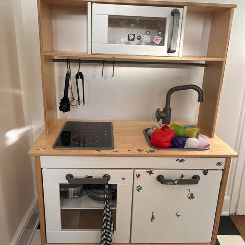 IKEA legekøkken i træ med hvid front. Legekøkkenet har kogeplader, vask med vandhane, ovn og mikrobølgeovn samt hylder til opbevaring. Der medfølger forskelligt legetøjstilbehør, herunder legetøjsmad, køkkenredskaber og kasseapparat, som kan opbevares i stofkasser.