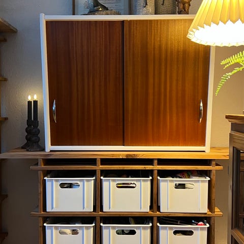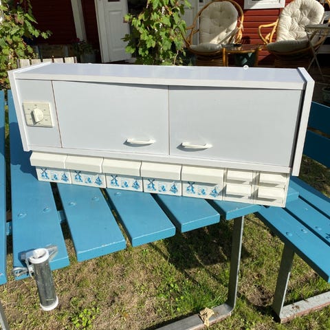 Flot, højt og superpraktisk køkkenskab. Til sommerhus eller lille køkken.Virkelig retro fra slut 1980'erne, hvor det kostede 8.000 kr. Snavset men i god stand. Meget nemt at finde ting i det pga hyldedesign. Der hører låger til, som haves, men de har aldrig været brugt som sådan (låger ses på foto md kurve). Afhentes i indre by mellem Nørreport og Søerne hurtigst muligt. Tak. Bemærk højden!