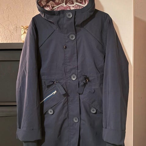 Frakken er brugt, men i fin stand. Der er lidt fnuller i foret indvendig i frakken, men ellers fejler den intet. Frakken kan justeres i taljen og lynlåsen kan lynes op, både oppe- og nedefra. Lynlås og knapper fungerer stadig perfekt. Kommer fra røg- og dyrefrit hjem.