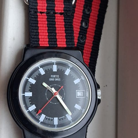 Skønt ældre ur fra Fortis Eden Roc med blå natorem. Slidt krone og “hårdt” optræk, så trænger til en kærlig hånd, men ellers pæn stand. Oprydning i samlingen.