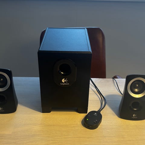 Logitech højttalersæt med subwoofer i sort. Sættet består af en aktiv subwoofer og to satellithøjttalere. Tilslutning sker via 3,5 mm jack til lydkilde samt dedikerede stik til venstre og højre højttaler på bagsiden af subwooferen. En af satellithøjttalerne har frontbetjening med drejeknapper til lydstyrke og lydindstillinger samt hovedtelefonudgang og ekstra 3,5 mm indgang på siden. Velegnet til brug sammen med computer, tv eller andre enheder med 3,5 mm lydudgang. Det er desuden aux indgang.