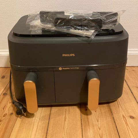 Philips airfryer i sort. Enheden har digitalt betjeningspanel på fronten med flere forudindstillede programmer og temperatur-/tidsindstillinger. Kurven har non-stick belægning og aftagelig indsats, som gør den egnet til tilberedning af forskellige typer mad som f.eks. pommes frites, kød og grøntsager. Egnet til brug i køkkenet som alternativ til traditionel friturestegning i olie.