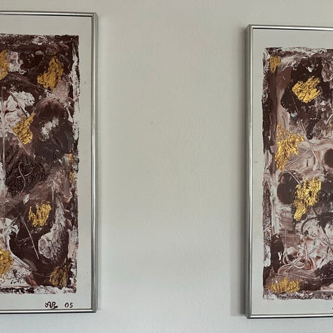 Abstrakt maleri bestående af to aflange lærreder 25b og 65h incl. sølvrammer i et sæt. Prisen er for dem begge. Sofie Tirsbæk