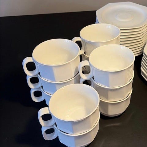 Bing & Grøndahl kaffekop med underkop og tilhørende lille tallerken i hvidt porcelæn. Jeg har 11 sæt med kop og underkop. Og 6 dessert tallerkner.