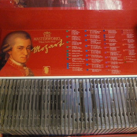 Brilliant Classics Wolfgang Amadeus Mozart Complete Works cd-boks. Samleboks med Mozarts komplette værker udgivet på cd. Boksen indeholder 170 cd’er med orkesterværker, kammermusik, klaverværker, korværker og operaer indspillet af forskellige orkestre, ensembler og solister. Indholdet er organiseret i individuelle covers i en samlet rød boks med oversigt over medvirkende kunstnere og værktyper på ydersiden.