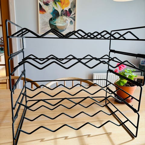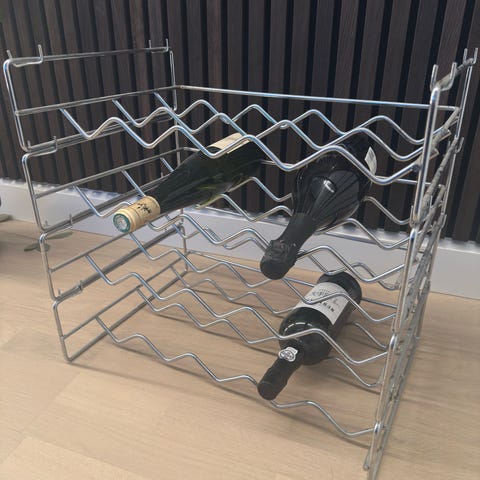 Vinreoler i stål med plads til i alt 10 flasker. Kr. 50 pr. sektion.