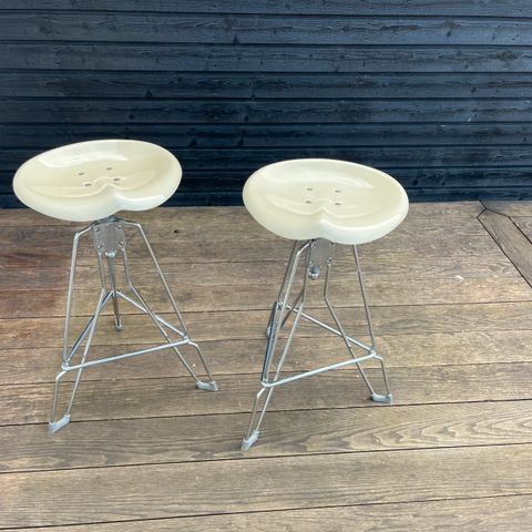 Sælger to utroligt smukke barstole designet af Yasu Sasamoto for Dulton Co. Ltd. Disse stole er kendt for deres unikke og industrielle udtryk med det karakteristiske traktorsæde i formpresset stål, som her fremstår i en flot og iøjnefaldende rød farve. Stolene kombinerer råt design med overraskende god siddekomfort og er et sandt statement piece i indretningen.