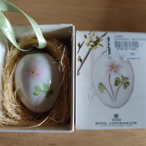 Royal Copenhagen påskeæg i porcelæn med motiv af forsythia og Munk. Sæt med to æg leveres i original æske med bånd til ophæng. Velegnet som påskepynt til ophæng på grene eller andre dekorationer i hjemmet.