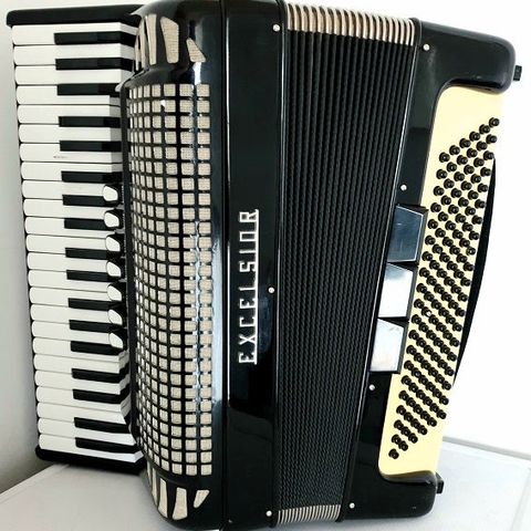 Flot Italiensk pianoharmonika med 41 tangenter, 3 kor og 7 omskiftere, samt 120 basser med 2 omskiftere.. Med brede seler.