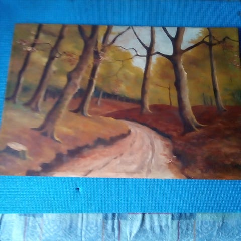 Maleriet er monteret i en klassisk ramme. Bagsiden viser træplade som underlag. Velegnet som vægdekoration i stue, gang eller lignende rum.