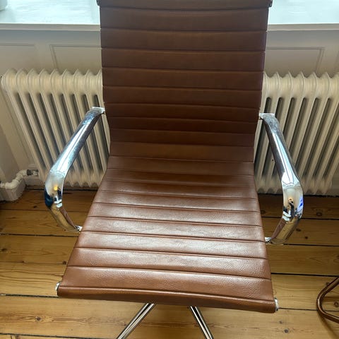 Kontorstol i vintage cognac tekstillæder (PU) som både indeholder bremsehjul, drejefunktion og højdejusterbart sæde. Meget fin stand. Normalpris er 1.194 kr. Kan ikke sendes - kun afhentes. Byd gerne:)
