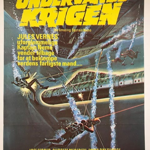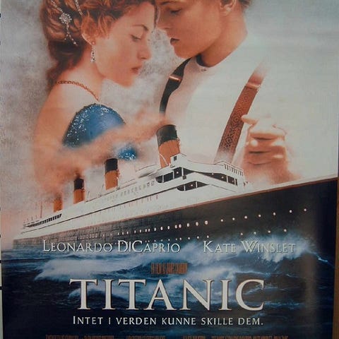 Titanic filmplakat. plakat trykt i USA til filmen Titanic fra 20th Century Fox. Motivet viser skibet Titanic forfra med filmens titel og credits nederst. Plakaten er trykt på papir og har synlige brugsspor og folder langs kanter og flader, som ses på billederne. Egnet til indramning eller ophæng for samlere af filmplakater og filmrelaterede effekter.