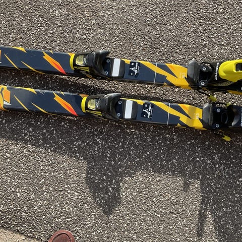 Rossignol alpinski med tilhørende støvler og stave. Skiene er i gul og sort med monterede bindinger. Støvlerne er sorte med gule og røde detaljer og lukkes med spænde. Skistavene er teleskopstave i gul med sorte håndtag og remme næsten ny. Sættet er egnet til alpint skiløb.