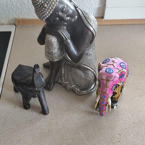Figurine skulptur i metal med siddende rytter på elefant. Figuren har flere arme og er udført med detaljerede mønstre og ornamenter på både rytter og elefant. Overfladen fremstår i en grønlig og gylden tone, som kan tyde på patineret metal. Egnet som dekorationsgenstand i hjemmet, fx på hylde, bord eller reol.