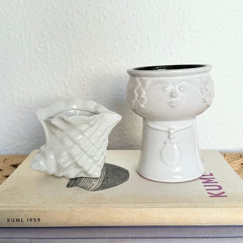 2 små konkylie urtepotter/skjulere. Ikke helt ens i hverken glasur eller udformning.