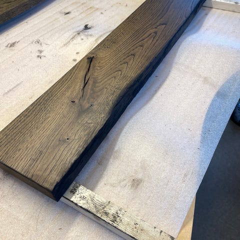 Yderkanten er bevaret med dens rå kant og patina, hvilket giver et fedt udtryk. På overfladen er egetræets åre trukket frem, så man kan se strukturen.