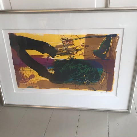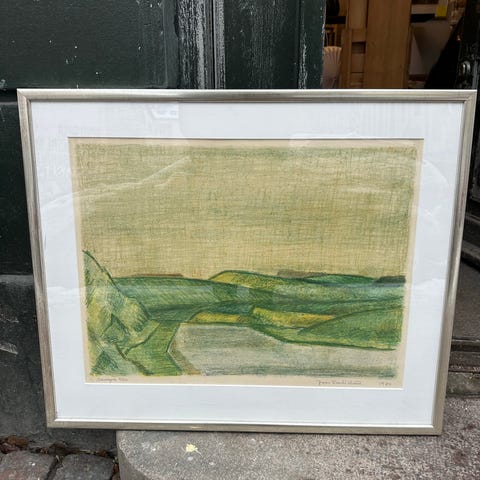 Stort flot litografi i træramme af Jeppe Vontilius.