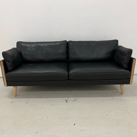 Horizont 3 Pers.Sofa med sort semianilin læder og ben/træ detalje i Egetræ.
