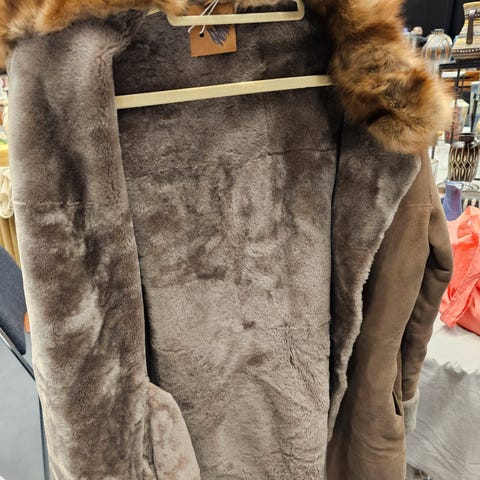Meget smart og lækker mørkeblå rulamsfrakke, slids i begge sider med lynlås, stiklommer med lynlås. Frakken kan vendes så pelsen er udad. Købt for lille, derfor til salg. Kun brugt 3 gange. Dejlig varm og smuk frakke til de kolde dage. Praktisk også til bilture fordi slidsen i siden let åbnes med kraftig lynlås. Farven er flot mørkeblå, den rette farve skal ses, farven på billedet er ikke dybblå nok.