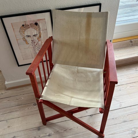 2 stk. velholdte foldbar instruktørstole. Lærredet til ryg og sæde fremstår ubrugt. Stolene har armlæn og krydsben, der kan klappes sammen for nem opbevaring. Egnet til brug både inde og ude, fx på terrasse, altan eller i haven. Konstruktionen er forstærket med metalbeslag ved samlinger for øget stabilitet.