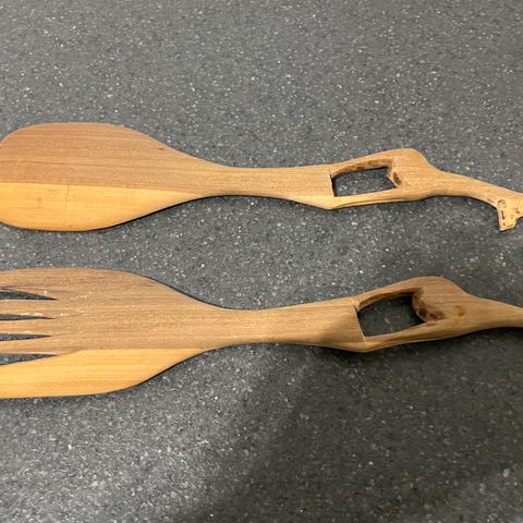 Fint udskåret TRÆBESTIK dvs. kniv, gaffel og ske til OPHÆNGNING eller til at LÆGGE på en hylde.