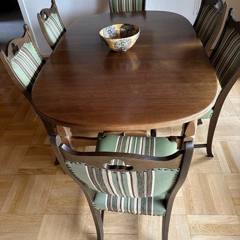 Retrosæt bestående af 4 stole samt et rundt bord dia 60cm og højde 76 et fint sæt i egetræ som kan sættes mange steder pris 750 kr sættet er i 7330 brande men kan leveres I Århus Silkeborg og Herning område