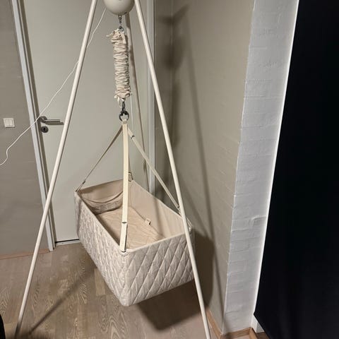Moonboon vugge til baby i lys, neutral farve. Vuggen hænger i et stativ og har bløde tekstiler omkring liggedelen. Egnet til spædbørn som sove- og hvileplads indendørs. Designet giver mulighed for let vugning af barnet. Velegnet til brug i soveværelse eller stue som ekstra soveplads til baby. Fungerer upåklageligt. Har været brugt til 2 børn og fra ikke ryger hjem.