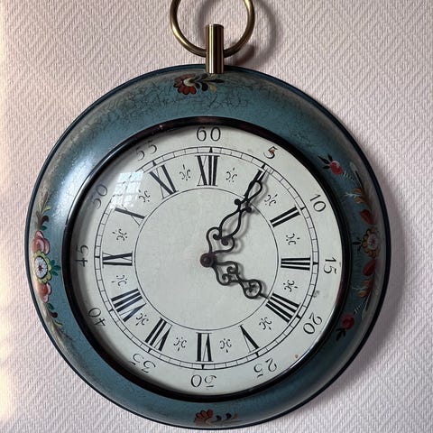 A. Lange & Söhne ur til unisex. Uret er indsat i et håndlavet kabinet udført som et lille standur med blåmalet træ og dekorationer i guldtoner omkring urskiven. Skiven viser både 12- og 24-timers markeringer med sorte og røde tal. Kabinettet er mærket med "Dansk håndarbejde" og har en åbning bagtil samt et hul i bunden til eventuel støtte af lommeur, som angivet på den indvendige inskription. Velegnet som dekorativt bord- eller hyldeur i hjemmet. Det er sparebøsse