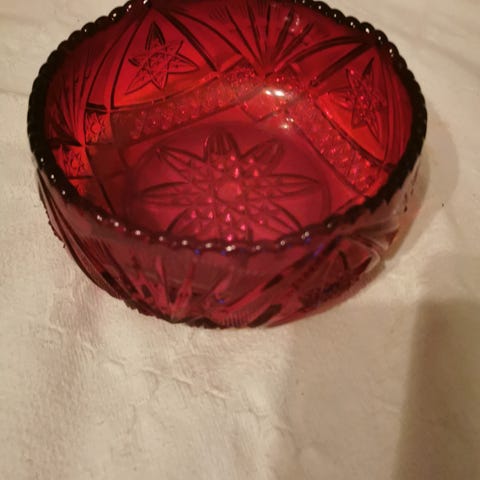 Skål af presset rød-orange farvet glas med gradueret farvespil fra gul/orange i bunden til mørkere rød i kanten. Skålen har bølget kant og kraftigt, facetteret reliefmønster på ydersiden samt stjerneformet mønster i bunden.