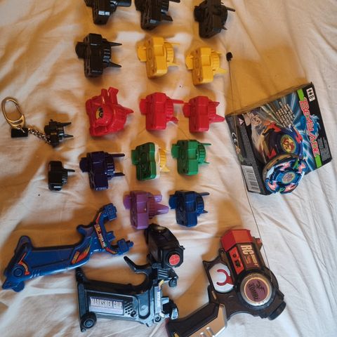 Blandede beyblades med 3 arenaer. Nogle af Beybladesene er lavet af metal, andre af plastik og i varierende størrelser. Der mangler "affyrere" til nogle af dem, men måske de også kan bruges som reservedele til andre.