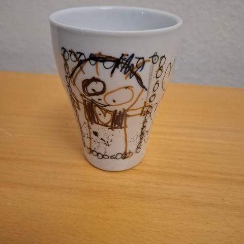 Aida Poul Pava Be Friends Beach krus i porcelæn med farverigt børnetegningsmotiv. Krusene har konisk form og er velegnede til varme og kolde drikke som kaffe, te eller kakao. Designet er en del af Poul Pava-serien med karakteristiske figurer og grafiske elementer rundt om hele kruset.