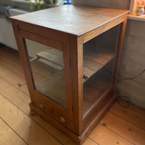 Vitrineskab i brunlakeret træ med glaslåge og dekorativt sprossemønster. Skabet har åbne hylder i den ene side, lukket skabsdel med glaslåge i den anden side samt to mindre skuffer nederst. Øverst er der en åben sektion med spejl. Bagsiden er udført i træpaneler. Skabet egner sig til opbevaring og udstilling af service, bøger eller pyntegenstande i stue, spisestue eller entré.