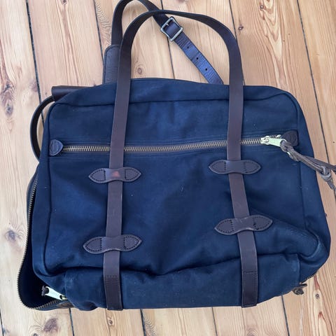 Original Briefcase fra Filson. Den ikoniske hverdagstaske i kraftigt twill metervare, med læderremme og kraftig messinglynlås. Denne taske bliver kun smukkere jo mere du slider den. Den kraftige metervare er vandafvisende og perfekt til helårsbrug i danmark. Tasken har stiklomme udenpå forsiden og bagsiden. Det store lynlåsrum er opdelt i tre, med rumdelere hvoraf den ene har plads til en række kuglepenne, nøgler og telefon. Til tasken medfølger en skulderrem i læder. Tasken kan rumme en 15" bærbar. Måler B:42 cm. H: 34 cm. D: 8 cm
