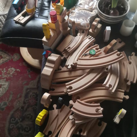 Stor samling af Brio, men der er også ting fra Ikea imellem som passer fint til Brio. To tog er selvkørende. Det sorte selvkørende tog kan sende damp op af skorstenen, ved at fylde toget med vand. Den kan godt drille, men det virkede sidst den kørte. Med de små sorte klodser kan man bygge videre på sin togbane med Duplo, de er ikke orginal Brio.