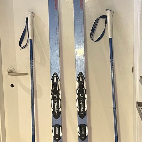 Fisherlangrendsski med bindinger. Skiene har klassisk langrendsprofil og er velegnede til brug på præparerede spor. Overfladen har hvidt og blåt design, og der er monteret sorte bindinger. Egnet til almindelig langrendstræning og ture i sneen.