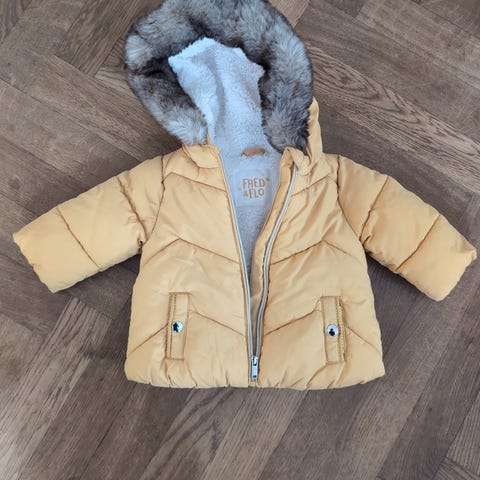 Flot gul jakke fra Fred & Flo. Aldrig brugt, da den desværre var for lille, da vejret blev koldt. Ved nærmere inspektion ses en lille fejl ved den ene lomme, men det er ikke fordi, den har været brugt. Fake fur på jakken.