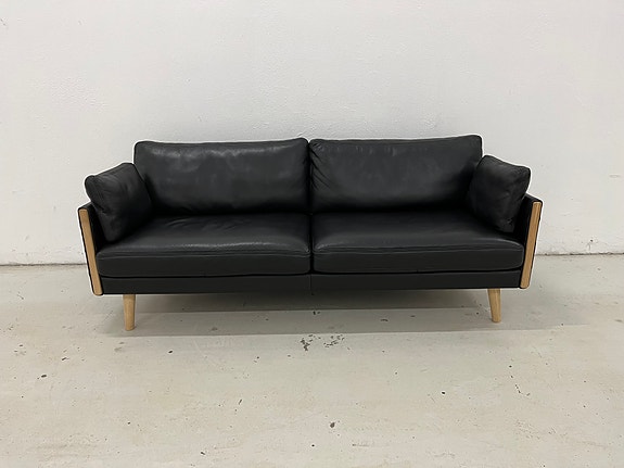 Der udbydes i alt 3 stk. Stouby Bella loungestole udført i sort semianilinlæder med stel i ubehandlet eg.