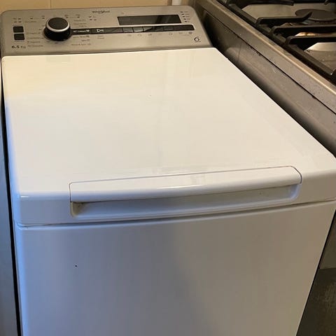 Whirlpool vaskemaskine i hvid. Frontbetjent model med rund låge og gennemsigtigt vindue, så tromlen kan ses. Maskinen har drejeknap og displaypanel øverst til valg af programmer og indstillinger. Egnet til almindelig tøjvask i husstande, kan indbygges eller placeres fritstående efter behov.
