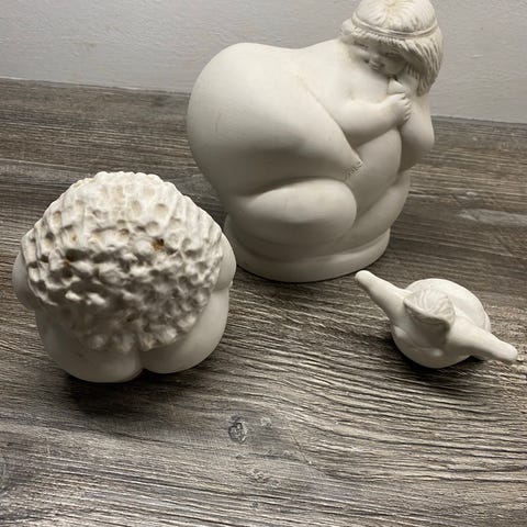 Tung figur, pæn stand, dog få skrammer som man ikke ser, da figuren er hvid med patina, og det hele “smelter sammen” i det hvide udtryk.