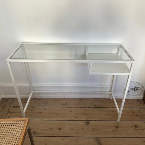 Elegant bord med klar glassplate og solid understell. Avhentes på nørreport.
