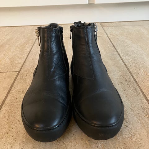 Vagabond støvler i str. 40. Støvlerne er sorte og går op til under knæet. De har kraftig, mønstret sål og lynlås i siden. Velegnede som hverdagssko i efterår og vinter. Sidder tæt til benet - derfor til slanke ben