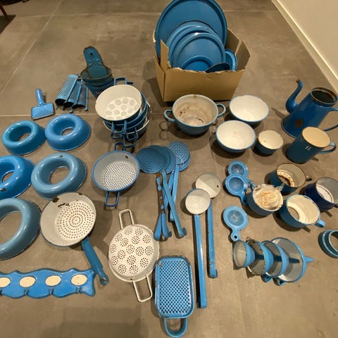 Vi har også mange andre dele, blandt andet kaffekander, dørslag, randforme, tragte, tesier, rivejern, hulskeer, ske til at øse op med, mange grydelåg og sågar en lille tekande. Måske omkring 100 enkeltdele.
