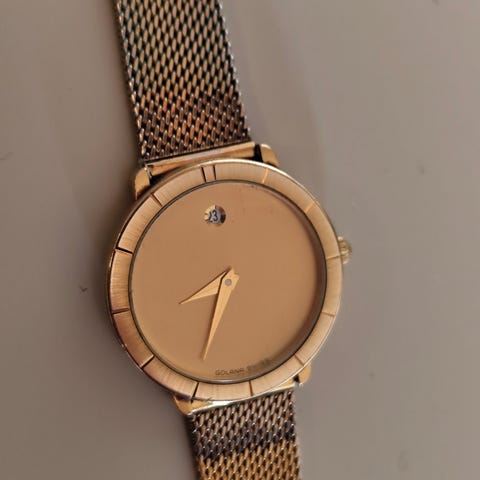 Golana Schweizer dameur med rund urkasse og brun læderrem. Uret har analog visning med enkel urskive uden talmarkeringer. Urkassen har gylden farve, og remmen lukkes med traditionelt spænde. Velegnet som hverdagsur til kvinder, der ønsker et enkelt og klassisk armbåndsur. Nyt batteri isat.