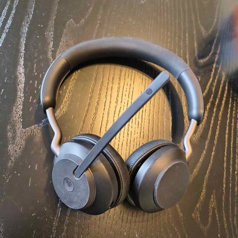Jabra headset med ladestand i sort. Trådløst headset med bøjlemikrofon og ørepuder, egnet til brug ved computer eller telefon til tale og møder. Med tilhørende ladestand og kabel til opladning/forbindelse. Velegnet til kontor- og hjemmearbejde, online møder og opkald.