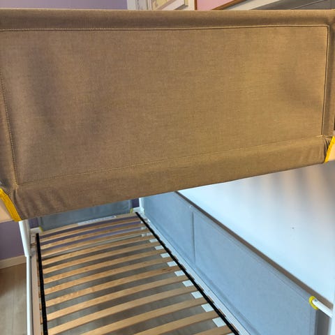 IKEA køjeseng i træ med hvide paneler. Sengen består af to liggepladser, en øverst og en nederst, forbundet med integreret stige i gavlen. Rammen er i træ med synlige åretegninger, og siderne er udført i hvide plader. Egnet til børneværelse med standard enkeltmadrasser (90x200). Sengen kan vendes så der kun er en enkelt soveplads. Velegnet til to børn.