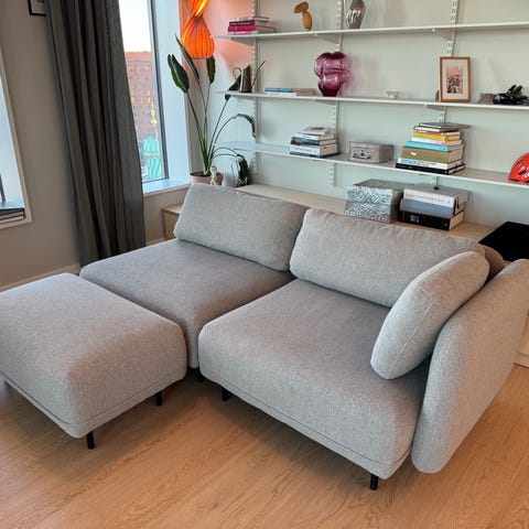 Conrad sofa fra Sofacompany i lysegrå fin uld. Højrevendt chaiselong og ben i egetræ. Sofaen er brugt, og har desværre fået tre pletter/plamager efter pletfjerning (ja, altså det et sæben som har sat sig …). Pletterne kan muligvis fjernes med tæpperenser, da det trods alt er sæbe-pletter/plamager.