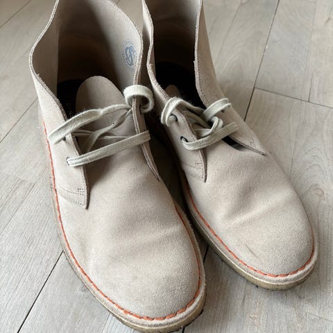Clarks Originals sko i blå ruskind i størrelse 42. Modellen har snørelukning og en kraftig, lagdelt sål i kontrastfarver. Overdelen er i blødt ruskind med markante syninger langs forfoden. På hælen er der et lille tryk med en vandrerfigur. Indersålen er mærket med Clarks Originals logo. Velegnet som hverdagssko eller fritidssko.